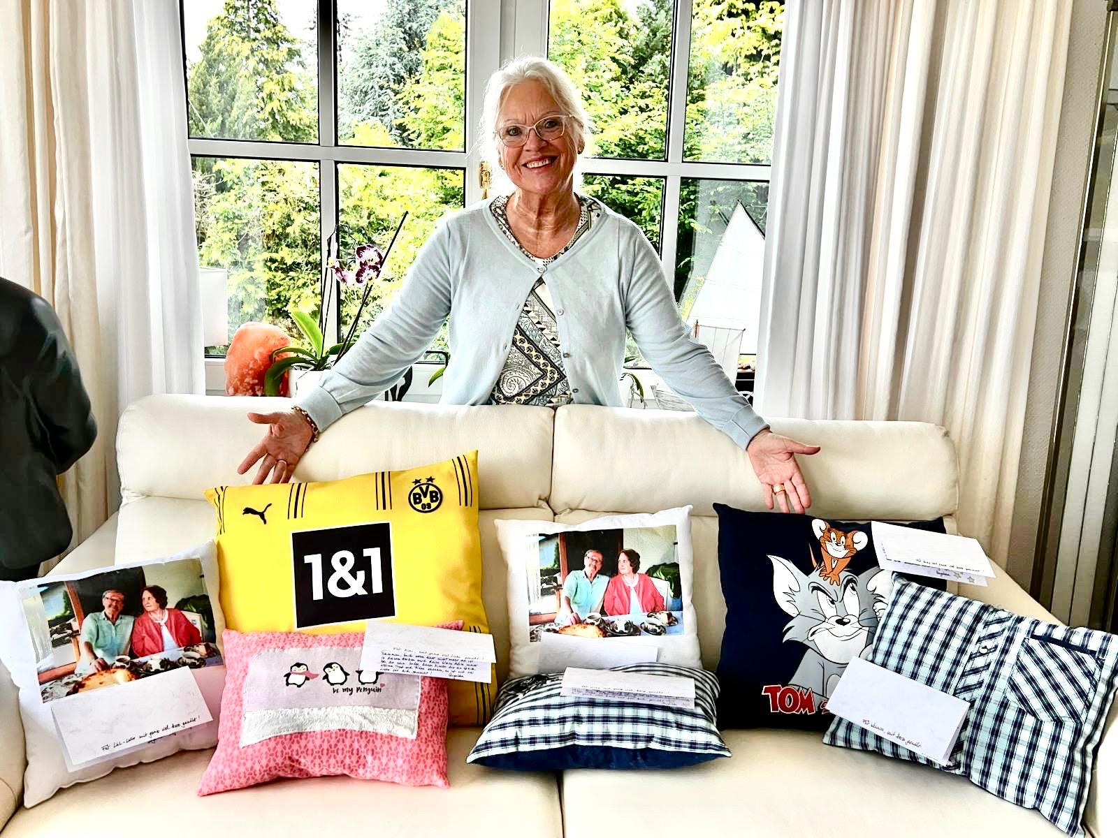 Frau Angelika Hagelauer hat für jedes Kind, aus von den Kindern mitgebrachten Stoffen, ein Kissen gefertigt. Jeder Stoff erzählt eine Geschichte, jedes Kissen birgt eine Erinnerung an die geliebte Person, um die die Kinder trauern. Sie sind Trostspender, die Wärme und Nähe schenken und ein Symbol der Liebe, die über den Tod hinausgeht.